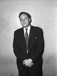 Jack Mauldin is working for the Star-Telegram Junior. His shift is from afternoons to early evenings in the reference room. Jack is standing against a wall, wearing a striped suit and a polka dot tie.