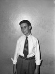Eddie Banner is one of the latest in the chain of offices boys passing through the third floor of the Fort Worth Star-Telegram. He is standing against a wall, wearing a button-up shirt with cuffed sleeves, necktie, and trousers.