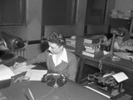 Star-Telegram Junior. Velma Marlin taking election returns. Velma is wearing a suite and is sitting at a desk with a pencil in her hand, writing on a piece of paper. On the desk is a telephone and a lamp. Beside the desk is a typewriter.