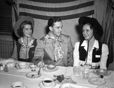 Typical Miss Texas contestants at Hicks Field. Worley Jones, Junior Chamber of Commerce, with Graze Swimme, San Antonio, Texas; and Miss Theo Nalley, Waco, Texas, right. They are seated behind a dinner table.
