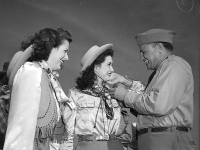 Typical Miss Texas contestants at Hicks Field. Miss Eleanor Metcalf of Temple, Texas and Miss Ruth Ruth Baird of Dallas, Texas, being greeted by Major C. E. Shankle of Hicks Field. The two ladies are seen dressed in cowgirl uniforms as Major Shankle pins his badge on Miss Dallas.