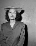 Mrs. Stanley Gunn (Catherine Gunn) has gone to work as reference room assistant at night. Her ready smile and efficient work have already endeared Catherine to night workers on the morning Star-Telegram and she is helping ease the burden of a filing system which has at times defied even the better minds on said edition. Catherine is shown standing against a bare wall, dressed well with a jacket and a hat. She is smiling and posing for the camera. Published in The Fort Worth Star-Telegram, March 15, 1945.