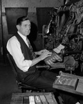 Last Take -- Jess Derden, who wrote the interesting story above on Star-Telegram yesterdays, snapped here as he set his last take of copy. He has retired. Mr. Derden is shown seated at the linotype machine. He is wearing trousers, full sleeve shirt, tie and a vest. Published in The Fort Worth Star-Telegram, March 15, 1945.