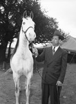 Southwestern Exposition and Fat Stock Show Horses. Gray mare "Heavenly Jane", an eight-year-old harness horse has won three consecutive blue ribbons in her field. She is exhibited by Knoxwood Farm of Dallas. Texas. She is trained by Joe Burnett and driven by Mrs. Knox Browning. Heavenly Jane stands 15.3 hands. She won in three fine harness classes as well as the fine harness stake in the Houston, Texas horse show. There is a man wearing a hat and a double breasted pinstripe suit holding Heavenly Jane's lead rope. There is a tree and a tent in the background.