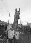 Southwestern Exposition and Fat Stock Show Horses. "Victory Star" is a seven year old gelding. He won a three-gaited saddle horse class. The large chestnut stands sixteen hands and was ridden by Oscar Heinrich. Victory Star is one of three horses in the Fort Worth, Texas show representing Mary Miller Stables of Pauls Valley, Oklahoma. Victory Star is wearing a turnout blanket and has his legs wrapped. There is a group of people behind him and a tent on each side of the muddy trail.