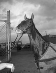 Southwestern Exposition and Fat Stock Show Horses. "President Lincoln" is owned by Charles Roeser and shown by Two Tuck Farm. President Lincoln is wearing a turnout blanket and standing by a chain-link fence. There is a parking lot and a building behind him.