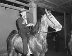 Southwestern Exposition and Fat Stock Show Horses. "Merry Bell" is ridden by S. W. Beech Junior of Wilson, Arkansas and owned by J. H. Crain. Merry Bell, won the first Horse Show stake judged at Will Rogers Memorial Coliseum. The four-year-old, red-roan mare won the walking horse contest. Mr. Beech is wearing a hat and suit. He is holding the blue ribbon in his mouth as he rides Merry Bell.