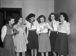 Star-Telegram Junior shot, girls dressed Ranch style. From left to right: Virginia Van Fleet, Maygene Autry, Susan Fairweather, Millie Coleman, Pat Scott and Martha Morris. The group of girls are all standing next to each other wearing long skirts and small bandanas around their collars. Pat Scott is looking at the camera smiling while everyone else looks at what Millie Coleman has in her hand.