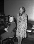 Star-Telegram. Dressed in Ranch style. Mrs. Bessie Schaffer and Rena Montfort. Mrs. Schaffer is sitting in a chair next to a standing Mrs. Montfort. Both women are wearing long dresses with bandanas around their necks. Mrs. Montfort's dress has an intricate pattern on it. In front of Mrs. Schaffer is telephone switchboard used to help with the newspaper.