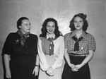 Star-Telegram. Girls dressed in Ranch style. Mary Sears, Marta Chamberlin and Peggie Spencer. The trio of women are standing in front of a wall wearing long skirts with bandanas around their collar and smiling. Miss Sears is looking off to the side.
