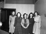 Star-Telegram. Girls dressed in Ranch style. From left to right: Eleanor Wilson, Rosalyn Graves, Ida Carlton, Edna Mitchell and Janice Conley. The group of women are all standing next to each other wearing long skirts, small bandanas around their collars and either a long sleeved shirt or a buttoned up jacket. They are smiling. Behind them is a wall and an open door.