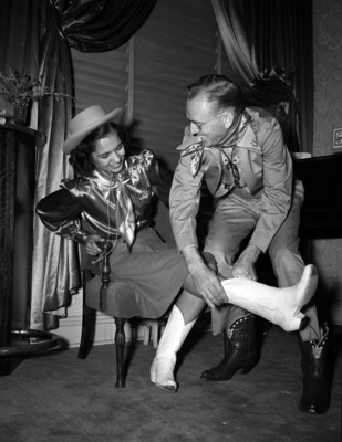 "Typical Miss Texas" contestants at Hicks Field. J. O. Knight helps Miss Dorothy Bryant on with her boots.