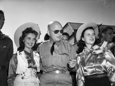"Typical Miss Texas" contestants at Hicks Field. Major B. S. Graham of Hicks field, with Maxine Fuson of Wichita Falls, Texas, left, and Christine Smith of Vernon, Texas. They are seen outside cheering while Major Graham explains flight maneuvers.