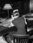 Lamm, Grace; Telephones; Desks; Newspapers; Papers; drawers; Files; Filing Cabinets; Lamps; Chairs; Dresses