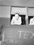 Home from overseas. As war-weary veterans from three corners of the earth paused for a brief period in Fort Worth, en route to Fort Sam Houston. Shown is Flight Surgeon George Siddons of Fort Worth, Texas. He is smiling and is leaning out the window of a railroad car. Published in The Fort Worth Star-Telegram Morning Edition June 26, 1945.