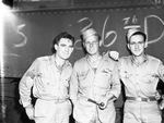 Home from overseas. As war-weary veterans from three corners of the earth paused for a brief period in Fort Worth, en route to Fort Sam Houston. Shown, standing side by side and dressed in their military uniforms, are returning veterans left, to right, Sergeant Willard Le Feure, Cleburne; Technician Fifth Grade Paul Barnett, Weatherford, and Technician Fifth Grade Cecil R. Handerson, Brownwood. Published in The Fort Worth Star-Telegram Morning Edition June 26, 1945.