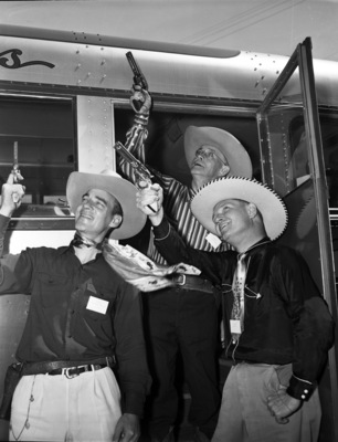 Fort Worth delegates. Left to right, Ray Crowder, John Reagan and Dan Hudson at the Johnson County Fair, Cleburne, Texas. All three men seen in their cowboy uniforms are pointing a gun in the air.