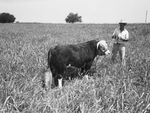 A shot of the cattle at the Arlo Farms, in Denton County, Texas. This modern stock farm owned by Mr. and Mrs. A. O. Phillips of Dallas. Shown here in the picture is Hazford Commander, the main herd bull that was bred at Harrisdale Farms, Fort Worth, Texas. An unidentified man, possibly a herder, wearing trouser, shirt and cowboy hat, is holding the bull's halter. Published in the Fort Worth Star-Telegram morning edition, July 1, 1945.
