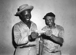 Two porters are pictured here. They are Willie Murray, right, and Maceo Dodd. They are shown standing against a bare wall and holding together a ten dollar bill and smiling. Maceo, night side metal man on the fourth floor, did not hear about the $10 gifts to the porters until Willie shows him what the boss gave him for Juneteenth. Published in the Fort Worth Star-Telegram, June 1945.