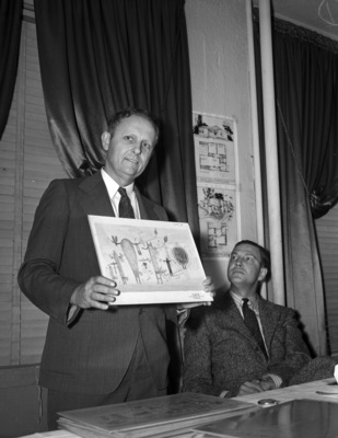 Ad Club. Forrest Kirkland, Dallas, Texas, displaying drawing he made of early Texas Indian painting.