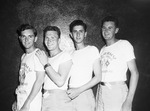 Four soldiers were in town to represent Camp Crowder at the Texas Sectional Tennis Tournament at the Colonial Country Club stopped by the Service Men's Center. Shown here is Private Jimmie Roberts, left, city tennis champion from 1941-43, played in the men's single in the tournament. A Texas Christian University (TCU) student for two years before his induction into the Army Signal Corps. Robert was visiting his parents, Mr. and Mrs. J. C. Roberts, and his sister and brother-in-law Mr. and Mrs. Charlie Hillard. Other members of of the camp's team were: Private first class Frank Smith, who went undefeated on the St. John's University team in 1942; Private Bert Hamilton of the Army Air Corps, Chicago, member of the University of Illinois team in 1942, and Private Bob Barker, Niagara Fall, New York, who won the championship in two national parks games before his induction. The four soldiers tennis players standing next to each other facing right. Published in the Fort Worth Star-Telegram morning edition, July 1, 1945.