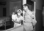 Nurse Frances Drake holds Barry Charles, the one-day-old son of Staff Sergeant and Mrs. Charles W. Madry, while his father gets first glimpse through a glass partition at Harris Memorial Methodist Hospital. Sergeant Madry is wearing his military uniform.