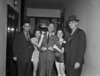 Ad Club. Mildred Chapman, and Virginia Moore, C. B. Spence, center, and Vice Squad Officers Newton, extreme left, and Crane, extreme right. They are seen side by side each other standing in the hallway. A skit, "You Don't Have to be Crazy (But it Helps)," is put on.