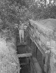 Captain Alex Barnes, training director, inspects a two-storied Japanese style bunker at Camp Wolters. He is wearing his military uniform.