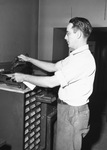 Star-Telegram Junior newspaper Joe Neal. After the plate is cut, the dealer's draw is put in separately, allowing change without re-cutting whole plate. Joe is seen proofing the plate. They are filed in order and place in trays below proof machines.