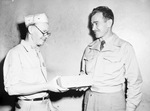 Star-Telegram Junior newspaper Clyde Andrews left, makes the official presentation of L. H. "Hammy" Thompson's 1944 Christmas gift. The gift missed Thompson while he was in Europe last winter but finally caught up with him back in the Star-Telegram press room.