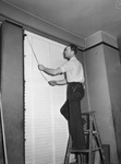 Star-Telegram Junior Shots. R. I. Anthony. Mr. Anthony of the Agee Blind Company puts up the first Venetian blind in the editorial third floor sanctum. He is shown standing atop of a wooden ladder installing the blinds onto a large window. He is wearing a pair of trousers and a tucked in, short-sleeved shirt. In his back pants pockets, there are a couple of tools.