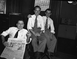 Familiar figures around the Fort Worth Star-Telegram and radio station are the three Smiths. Left to right, they are Clarence Smith and his sons, Jake and Johnnie. Mr. Smith is the assistant circulation manager. He started working for the Star-Telegram 30 years earlier. He is sitting in a chair, wearing a dress shirt with rolled-up sleeves and a necktie. Mr. Smith is holding a copy of the Star-Telegram. Jake works in the national advertising department He is wearing a suit, without a jacket. Johnnie is with the engineering department of the radio station. He has an arm around his brother and is wearing a suit without the blazer.