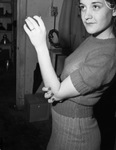 May Jean Autry is standing sideways with her right hand around her left elbow. She is wearing a short-sleeve sweater and a striped skirt. She is wearing a ring on her ring finger on her left hand.