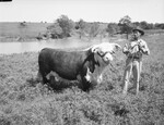 Pictured here are Dale Burleson and WHR Royal Cadet, champion Hereford bull and grand champion of the beef breeds in the Wise County Breeder-Feeder Show at Decatur, Texas, this week. Dale, herdsman, is holding the champion bull by its halter. He is in a cowboy attire. They are standing in a meadow with a lake and trees in the background. The Hereford bull is owned by Frank D. Jones of Decatur, Texas. Published in the Fort Worth Star-Telegram morning edition, May 17, 1946.