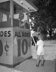 Midsummer Day's Dream Come True -- Three-year-old Albert DeLoss Bronson shot the works when he bought this long string of tickets from W. E. Garrison at the playground at 1700 University Drive. Albert is shown standing in front of the ticket booth. The booth showing "All Rides ten cents (10¢)." The ticket seller Mr. Garrison is inside the booth, smiling and handing the string of tickets to Albert. This child is the son of Mrs. Roth Bronson, 605 Samuels. Published in The Fort Worth Star-Telegram morning edition, July 10, 1946.