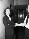 Margie Lee Hamilton, 30, trick rider, who murdered her ex-husband Andy Robinson in her room at the Exchange Hotel, 2415 Ellis Street, Fort Worth, Texas. She is wearing a pinstripe blazer and skirt and is leaning against a wall. Standing at the far right (partially out of frame) is an unidentified woman.