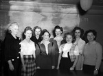 Photograph published in "Star-Telegram Junior," a paper for Star-Telegram employees. Star-Telegram country circulation extras are ( left to right) Glenda Brannon, Virginia Buford, Billie Autrey, Evelyn Jones, Dorothy Crosby, Thelma Murrell and Katherine Shackelford. The women are shown grouped up together, grinning widely for the camera. Each of them are dressed in different skirts, sweaters and tops. Behind them is an empty wall and in front of them is a desk.