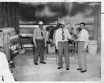 Robert Gould, WBAP-TV program director, accepts new "props" in the form of a horse from L. White (left), Fort Worth saddlemaker, and George Wilderspin (middle), Fort Worth stockman, ca. 1949