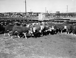 Hereford bulls sold to Ray Lum of Vicksburg, Mississippi, by Duwaine E. Hughes of San Angelo, Texas, unloaded at the Fort Worth stockyards for feed, water, and rest before making the trip to Mississippi, 04/1939