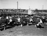 Hereford bulls sold to Ray Lum of Vicksburg, Mississippi, by Duwaine E. Hughes of San Angelo, Texas, unloaded at the Fort Worth stockyards for feed, water, and rest before making the trip to Mississippi, 04/1939