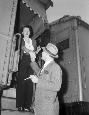 Image shows Mr. and Mrs. John Ringling North in their home on wheels during their stop in Fort Worth with the 'greatest show on earth'. They are departing from a train, John Ringling North, president of Ringling Brothers and Barnum and Bailey Circus, helps his bride off the train, the former Germaine Aussey, a French movie star. Published in the Fort Worth Star-Telegram morning edition September 22, 1940.