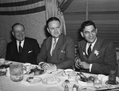 Fort Worth Round Table of the National Conference of Christians and Jews. Left to right, T. N. Whitehurst of Beaumont, T. Austin Gavin of Tulsa, Oklahoma, and Lewis B. Lefkowitz of Dallas, Texas. These three were speakers at a luncheon at the Blackstone Hotel. They are shown sitting at a table in suits and ties, eating.