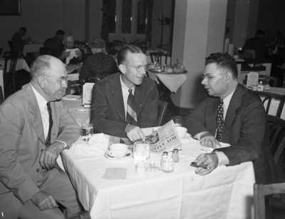 The Texas Circulation Managers Association is meeting at the Hotel Texas. They are enjoying breakfast, coffee, and the morning newspaper before the afternoon convention. They are left to right, L. E. Gillett, P. F. Fincher, and L. W. McFetridge. Mr. Gillett of the Beaumont Enterprise and Journal, is chairman of the board. He is dressed in a light suit. Mr. Fincher, of Austin American and Statesman, is the state president. He is wearing a suit with a striped necktie. Mr. McFetridge, of the Tulsa World, is the secretary treasurer of the International Circulation Managers Association. He is dressed in a suit and smoking a cigar.