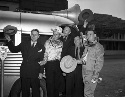Fort Worth Optimist Club members attending the Wichita County Fair include (left to right) J. C. Green, Lowell Crowder, Tommy Thompson, H. L. Graves, and John Welsh.