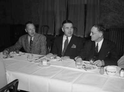 Big Bend National Park Boosters. Left to right, Harvey Cornell, Santa Fe, New Mexico, Harry Connelly, Fort Worth, Texas, and Doctor H. W. Morelock at a dinner in Alpine, Texas. All of them wear suits and seated by the long table. Published on September 29, 1940.