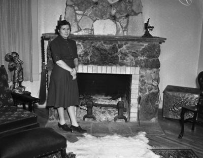 Mrs. F. L. Motheral standing by the stone fireplace in the family's home on their 80-acre farm near Rendon, Texas. On the mantel above the fireplace are two figurines. Beside the fireplace, left, is a statue. Also in the living room are several chairs and an animal fur rug. The Motheral home is an example of urban comfort in a rural setting which has attracted many city dwellers. Published in the Fort Worth Star-Telegram evening edition, January 29, 1940.