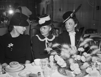 These women talked about the new styles, politics and civic progress at an informal luncheon opening the District 8 Conference of Pilot International at Hotel Texas. Sitting left to right are Mrs. Elizabeth Egert, Galveston, Texas, District 8 governor; Mrs. Inez Caviness, first president of Fort Worth Pilot Club; and Mrs. Marguerite Dimerling, Beaumont, Texas, second vice president of Pilot International. They are sitting at a dining table. On the table is a flower arrangement center piece and various tableware. Mrs. Egert is wearing a dark colored dress with a floral brooch pinned on the bodice, and a hat with a feather. Mrs. Caviness is wearing a dark colored dress with lace trim around the collar and vertically down the bodice, and a hat. Mrs. Dimerling is wearing a light colored blouse, pinstripe blazer and a hat with a feather.
