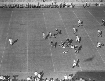 Texas Christian University (TCU) vs. Centenary College football game. Beecher Montgomery, Texas Christian University, with the ball, running in the open field. Most of the players on the field are visible in this shot, along with four referees; everyone is wearing their respective uniforms. Montgomery is in the center of the picture running behind his teammate, Charley Conway. Two Centenary defenders, May, bottom, and McCrary are very close behind Montgomery and chasing after him. The entire Centenary bench players and coaches can be seen at the top of the picture while many of the Texas Christian University bench players and coaches can be seen at the bottom of the picture. Conway blocked these Centenary players a moment after this picture was taken and Montgomery would score on this play. Star-Telegram Morning, September 29 1940.