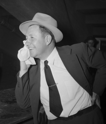 Texas Christian University vs. Centenary College football game. Walker Cheney, mopping his face after the afternoon sun had been slapping him on the back for two quarters. Mr. Cheney is wearing a suit, tie, and hat and is leaning on his right arm which is propped against a table. He is holding a towel to his face.