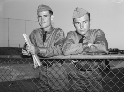 Texas Christian University vs. Centenary College football game. Spectators (left to right) Bob Butler, Saint Pauls, North Carolina and Graham Johnson, Scotland Neck, North Carolina, both of whom are Hicks field flying cadets. Mr. Butler and Mr. Johnson are wearing matching uniforms, ties, and hats. The men are leaning on a fence while Mr. Butler is holding a folded up paper in his hands. Star-Telegram Morning, September 29 1940.
